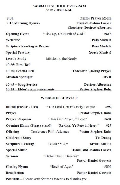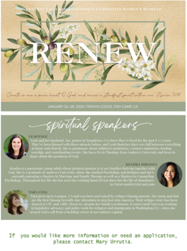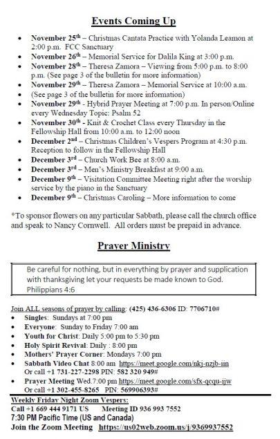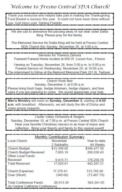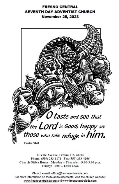 If you would like to join choir or orchestra in the Christmas Cantata this December, please come to the rehearsal on Sabbaths, at 2:00pm in the Fresno Central sanctuary. The cantata performance at Fresno Central will be on Dec. 16. We will also be performing at three other churches in December.